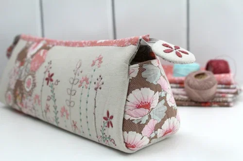 Patroon van Hugs 'n Kisses, Jojo's garden een etui om zelf te maken met hexies en stichery bloementjes erop. Een combinate van naaien, quilten en borduren in één patroon. Leuk om cadeau te geven en om zelf te maken voor als een keer watanders wil naaien.